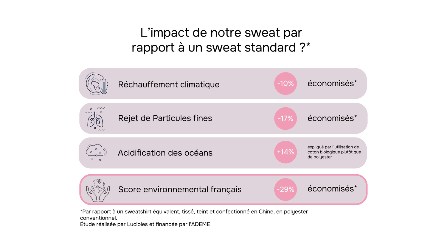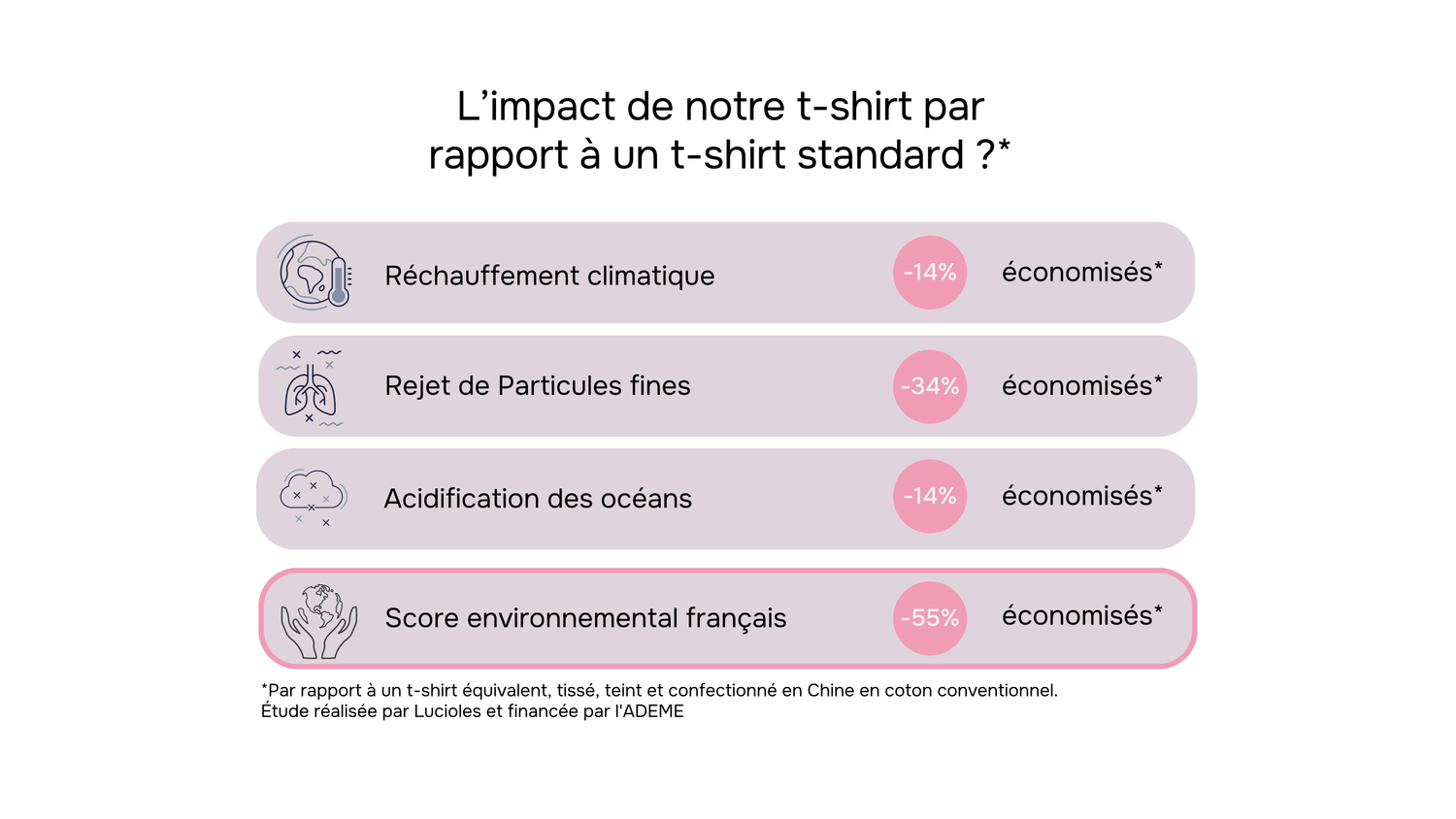 Leucate Ride a mesuré l’impact environnemental de ses vêtements grâce à un audit réalisé par Lucioles Conseil, financé par l’ADEME (Agence de la Transition Ecologique). L'évaluation couvre l'intégralité du cycle de vie des produits, de la fabrication à la fin de vie. Cet audit a permis de comparer nos t-shirts et sweats à ceux de la grande distribution sur des critères tels que le changement climatique, l’acidification des océans, et le rejet de particules fines.